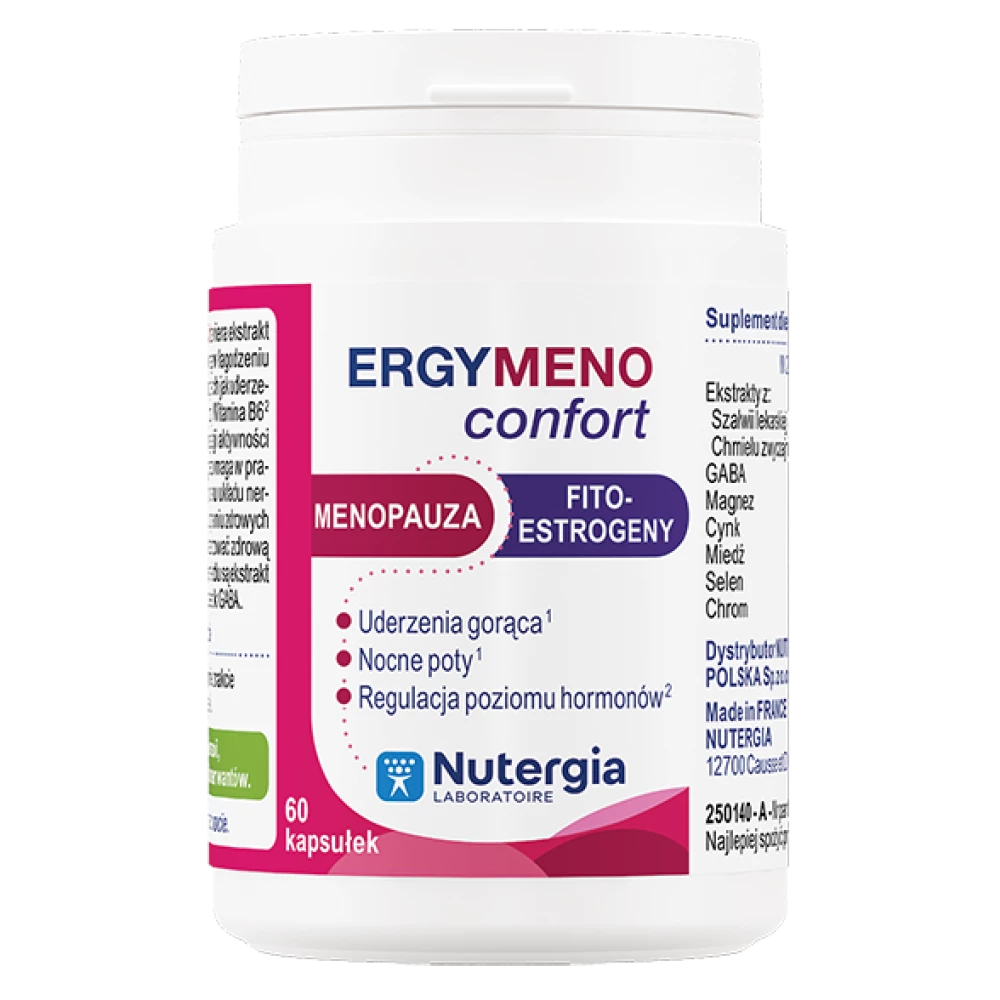 ERGYMENO confort ma działanie fitoestrogenne - zawiera 2 rośliny regulujące, które pomagają przywrócić komfort w okresie menopauzy. Szałwia wpływa na złagodzenie objawów menopauzy takich jak uderzenia gorąca i nocne poty.